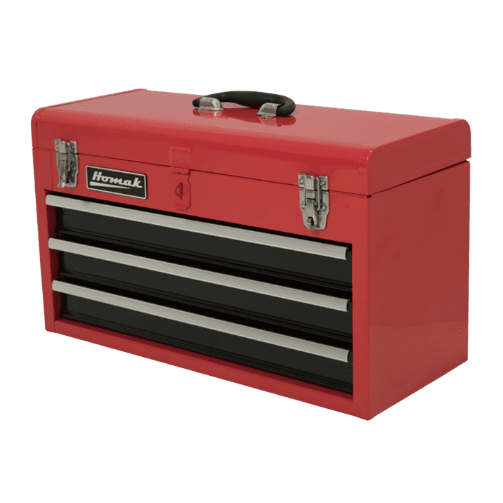 20 inch steel hand carry toolbox equipped with three (3) drawers has removable ball-bearing drawer slides
