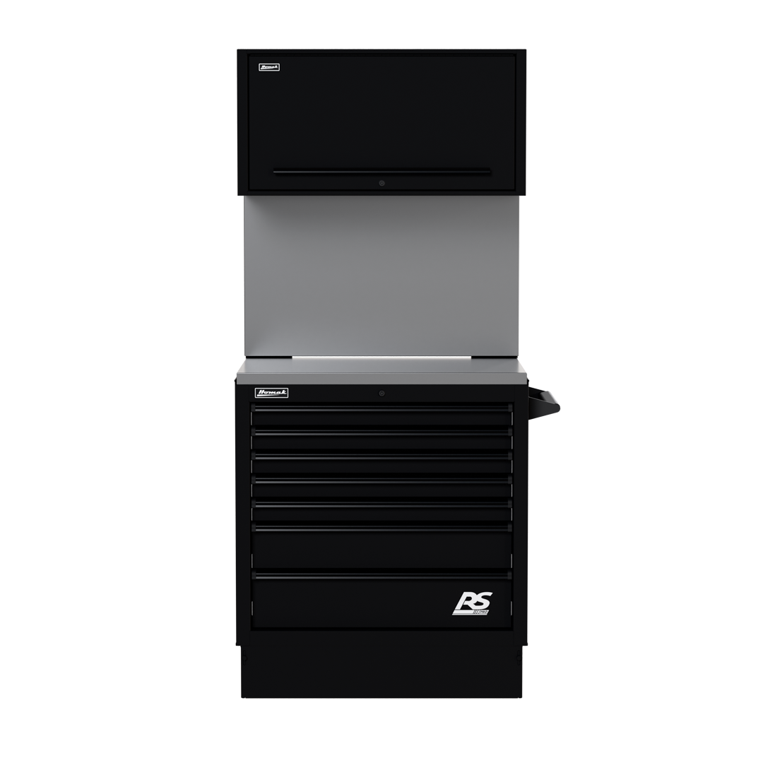 Full-length black aluminum contoured, scoop-style lift latch drawer pulls prevent drawers from opening and provides hassle-free access to tools
