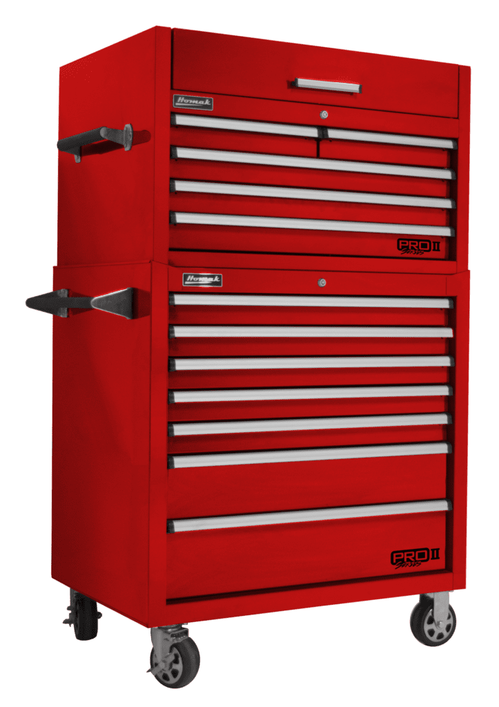 Full-length silver aluminum lift latch drawer pulls prevent drawers from opening and provides hassle-free access to tools