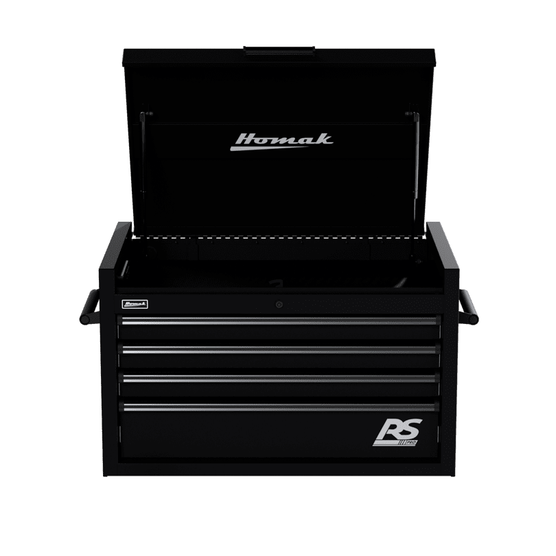 Full-length black aluminum contoured, scoop-style lift latch drawer pulls prevent drawers from opening and provides hassle-free access to tools