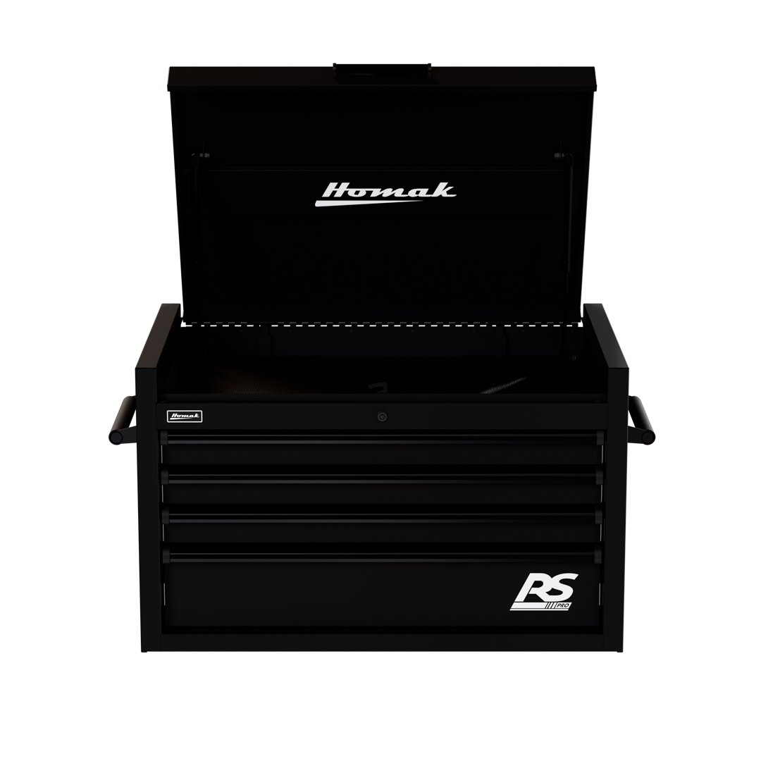 Full-length black aluminum contoured, scoop-style lift latch drawer pulls prevent drawers from opening and provides hassle-free access to tools