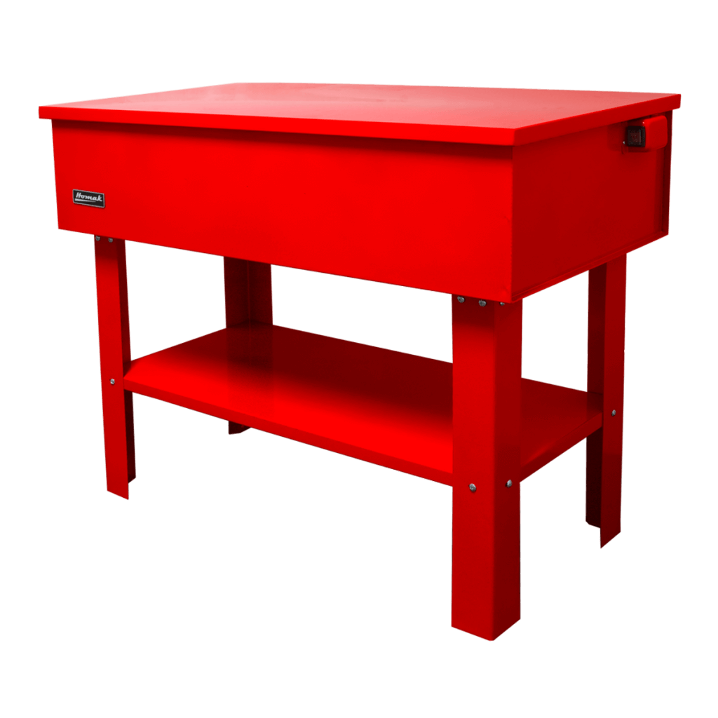 Single-piece leakproof, solid steel water-based solvent tank has a fusible linked lid arm hinge to prevent accidental injury or fire hazards