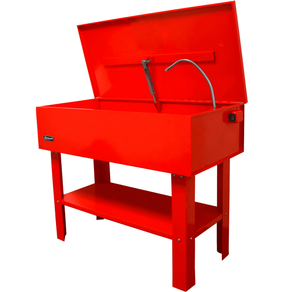 Single-piece leakproof, solid steel water-based solvent tank has a fusible linked lid arm hinge to prevent accidental injury or fire hazards