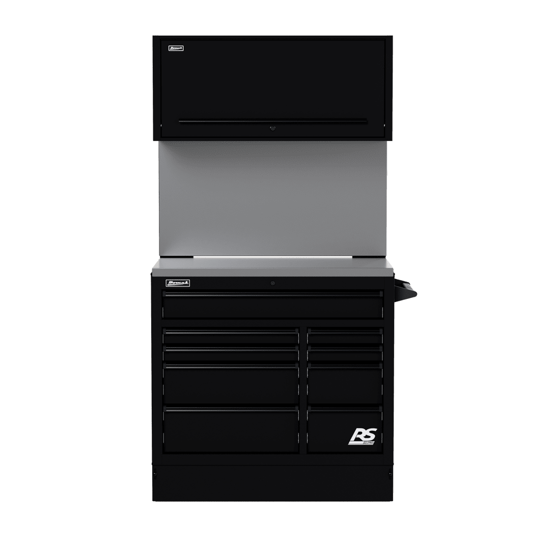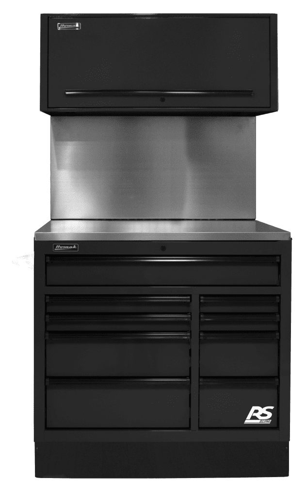 Full-length black aluminum contoured, scoop-style lift latch drawer pulls prevent drawers from opening and provides hassle-free access to tools