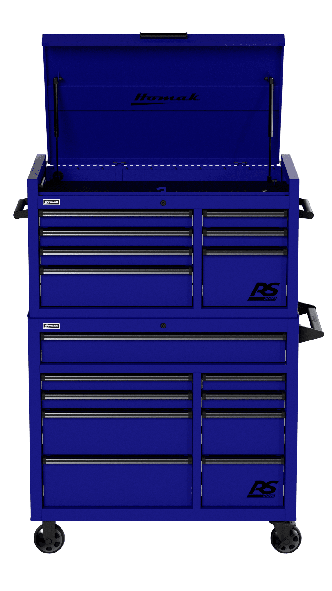 Top Chest includes seven (7) drawers and lockable top till with full-extension gas struts and a power strip containing three (3) electric outlets to store and charge phones, laptops, and other devices.
