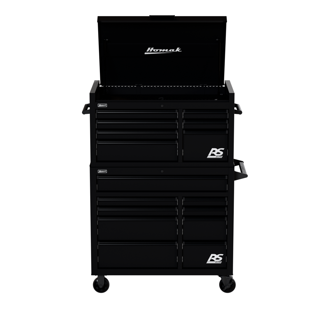 Full-length black aluminum contoured, scoop-style lift latch drawer pulls prevent drawers from opening and provides hassle-free access to tools