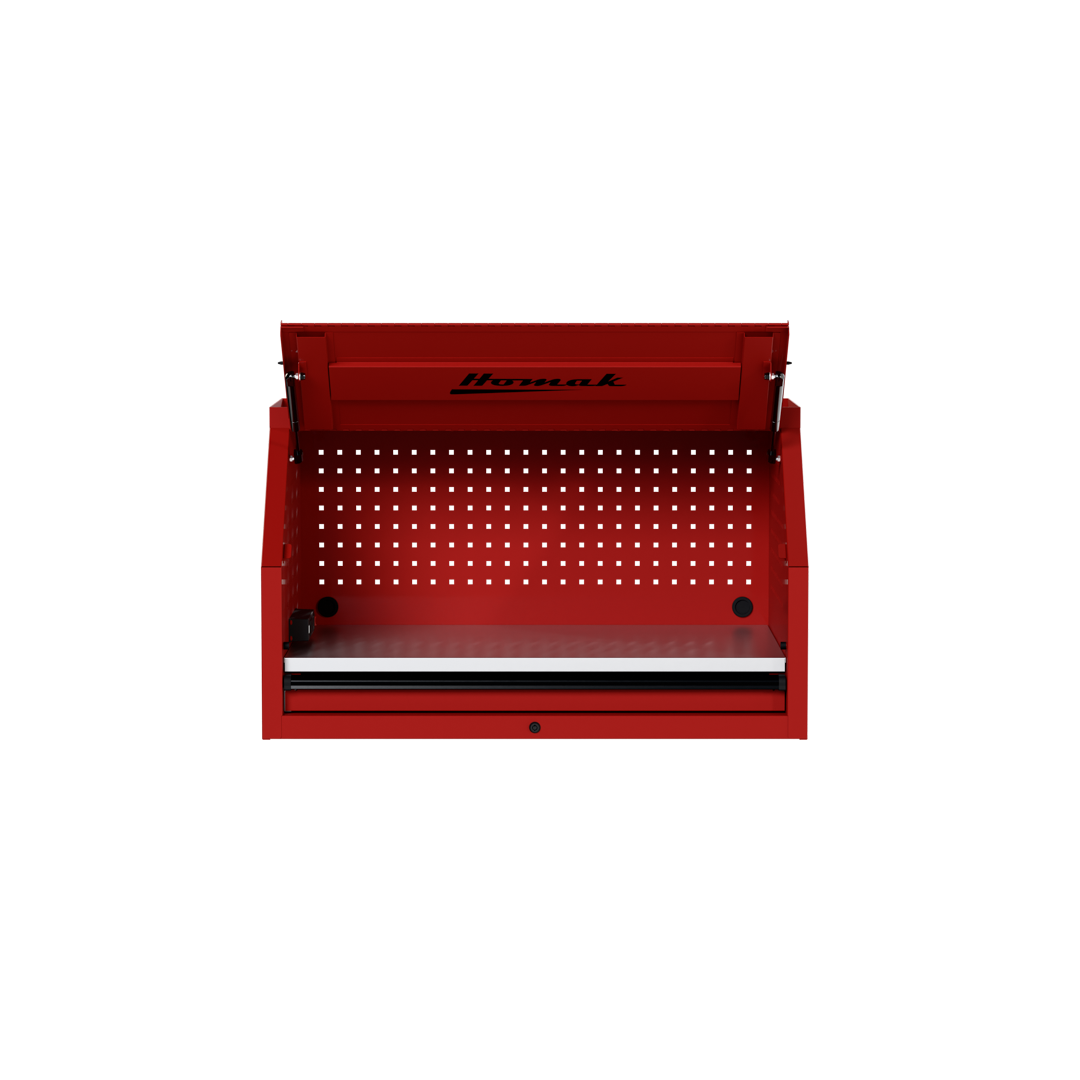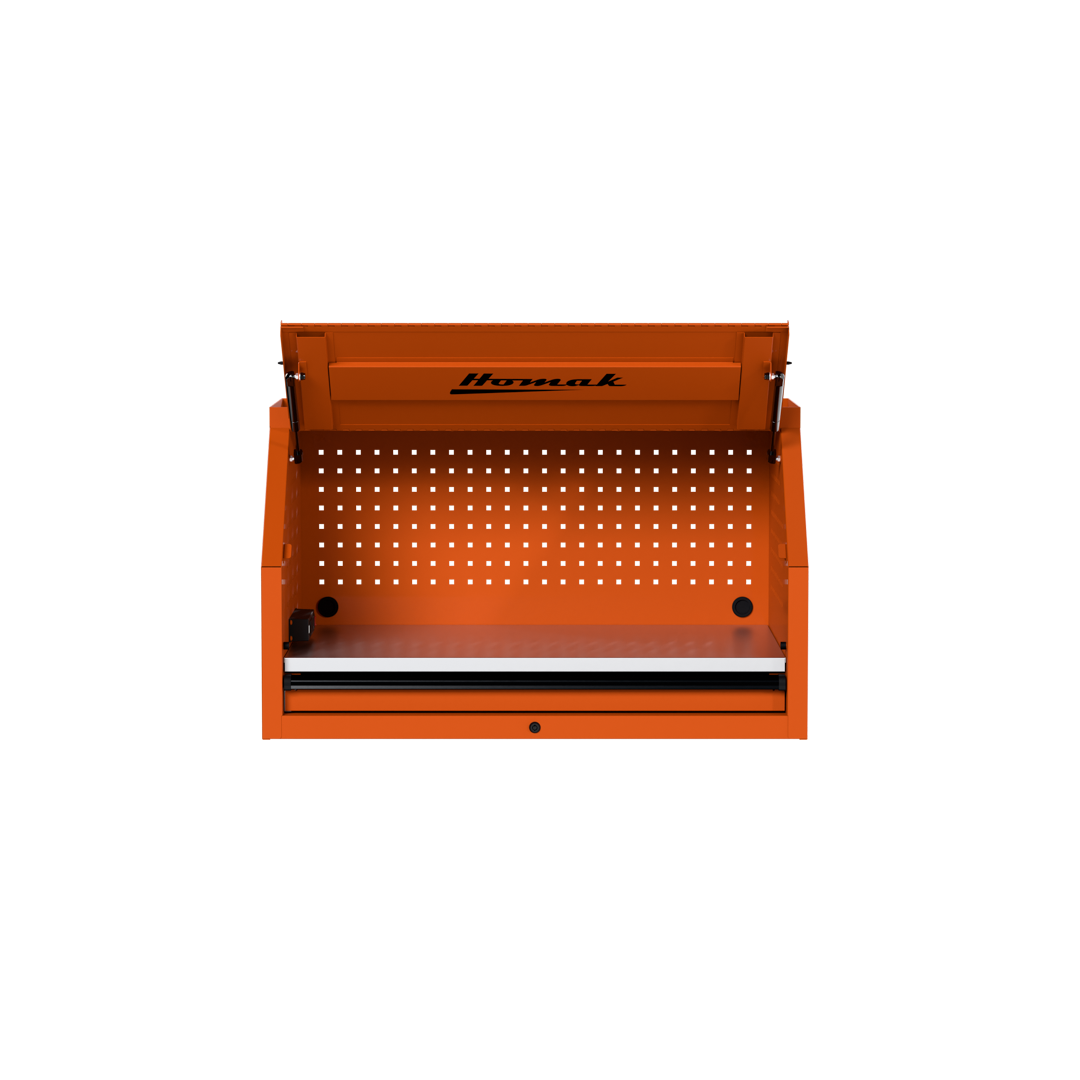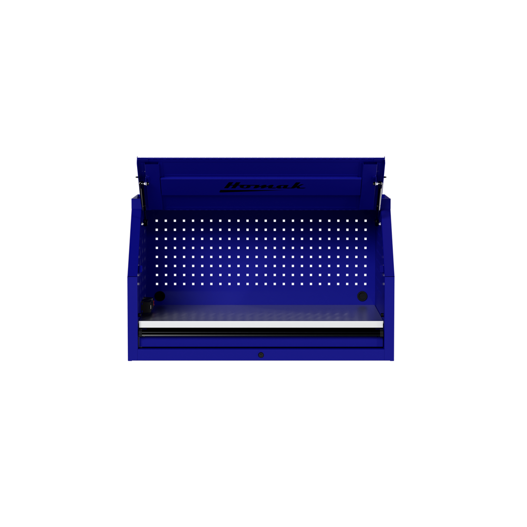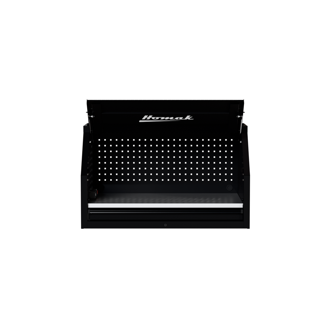 Lockable top hutch includes full-extension gas struts, grommet cutouts, and a power strip containing four (4) electric outlets and two (2) USB ports to store and charge phones, laptops, and other devices