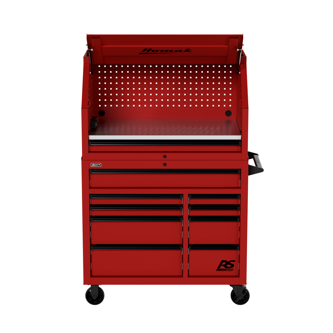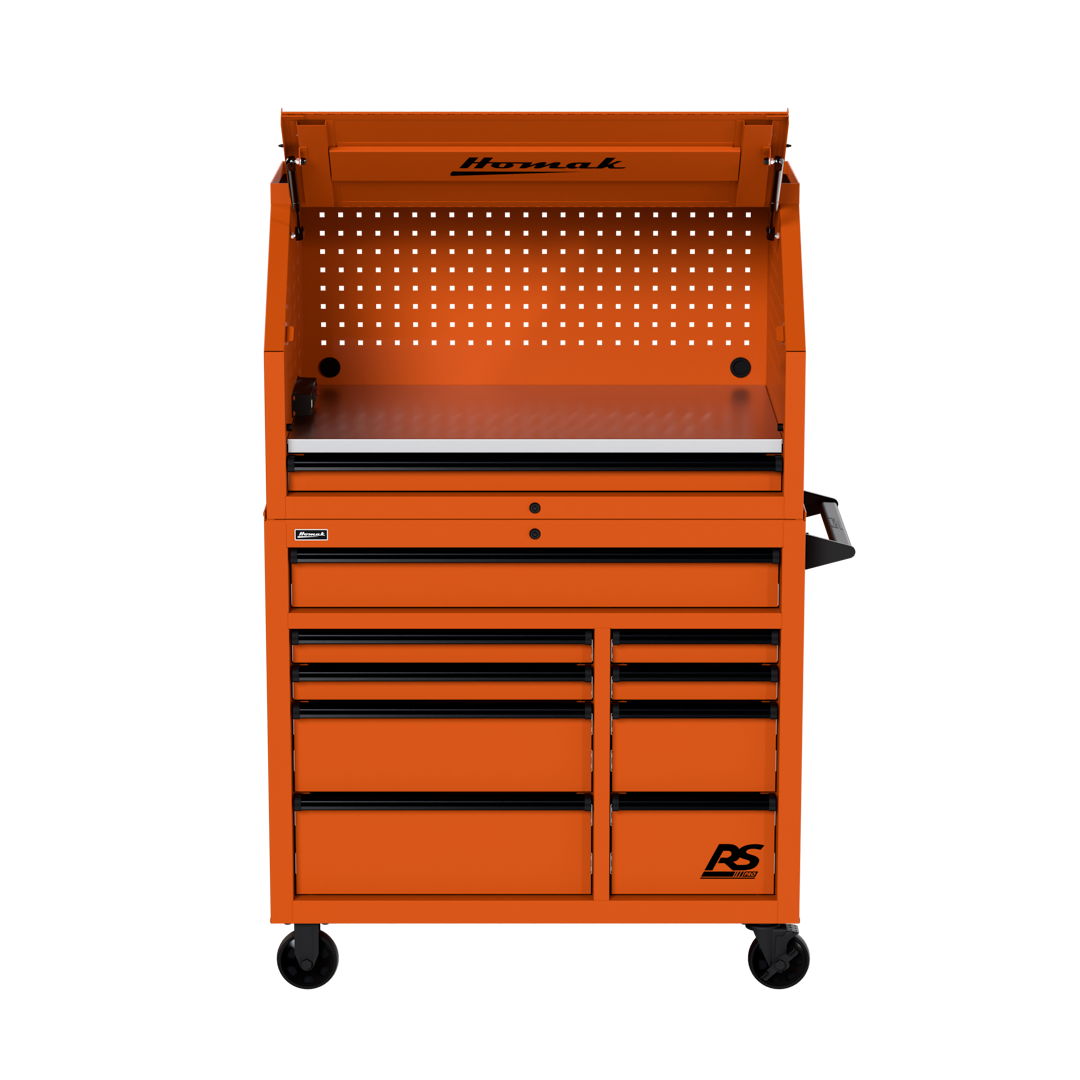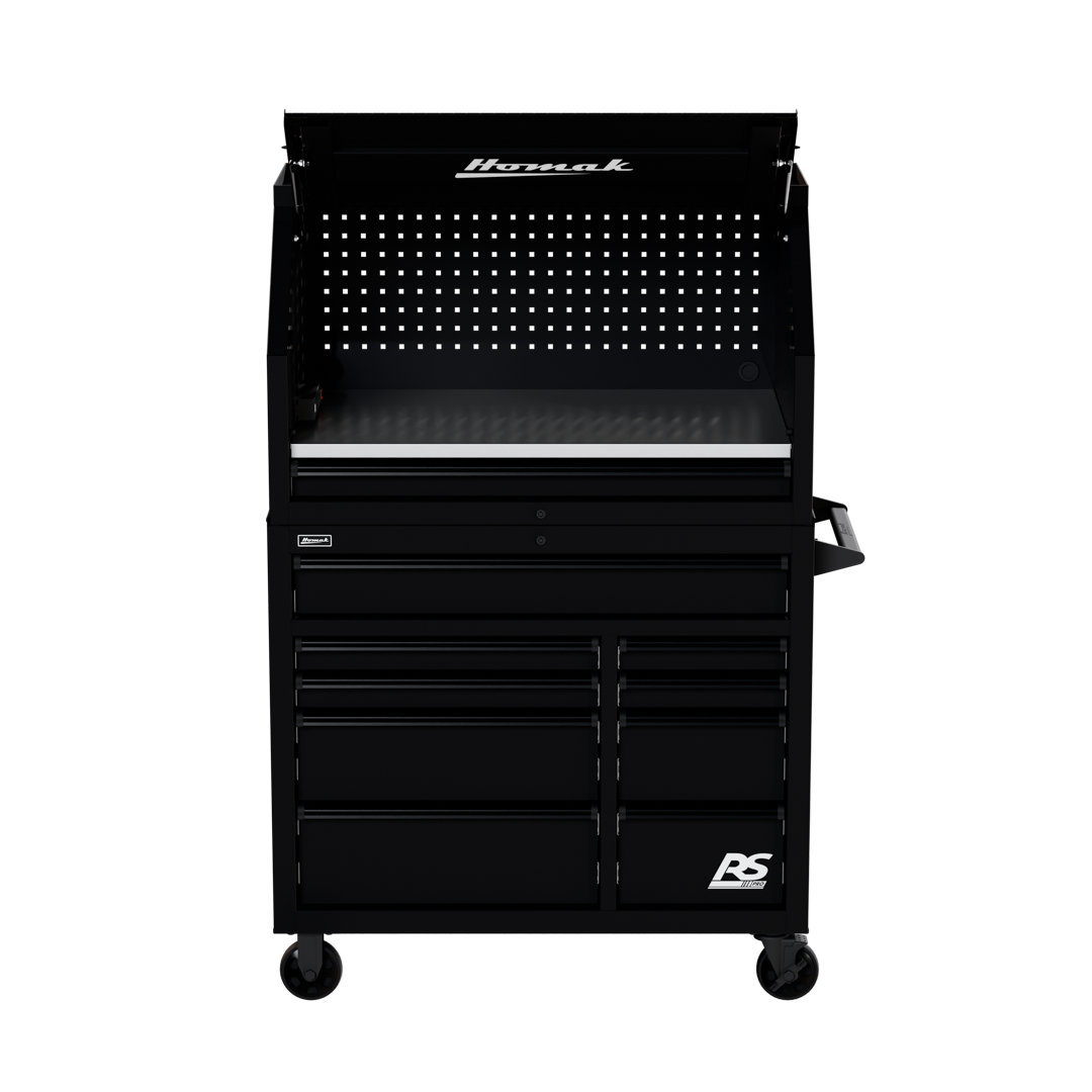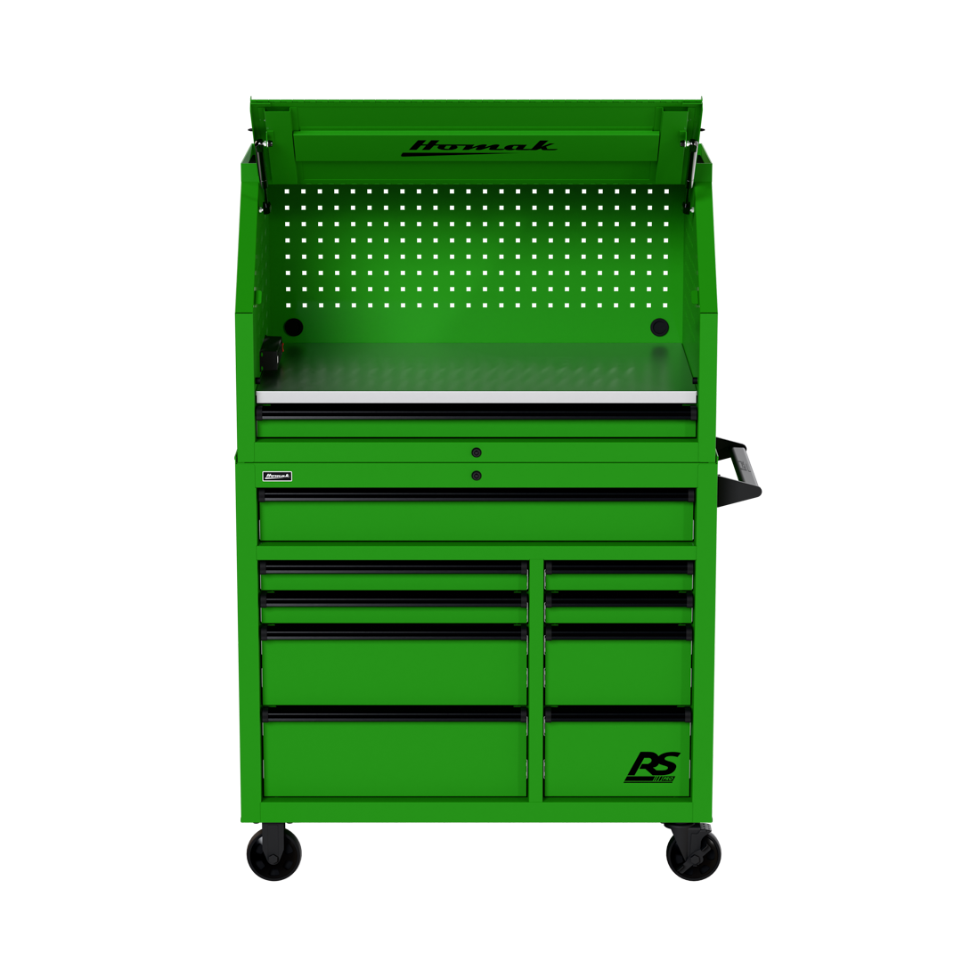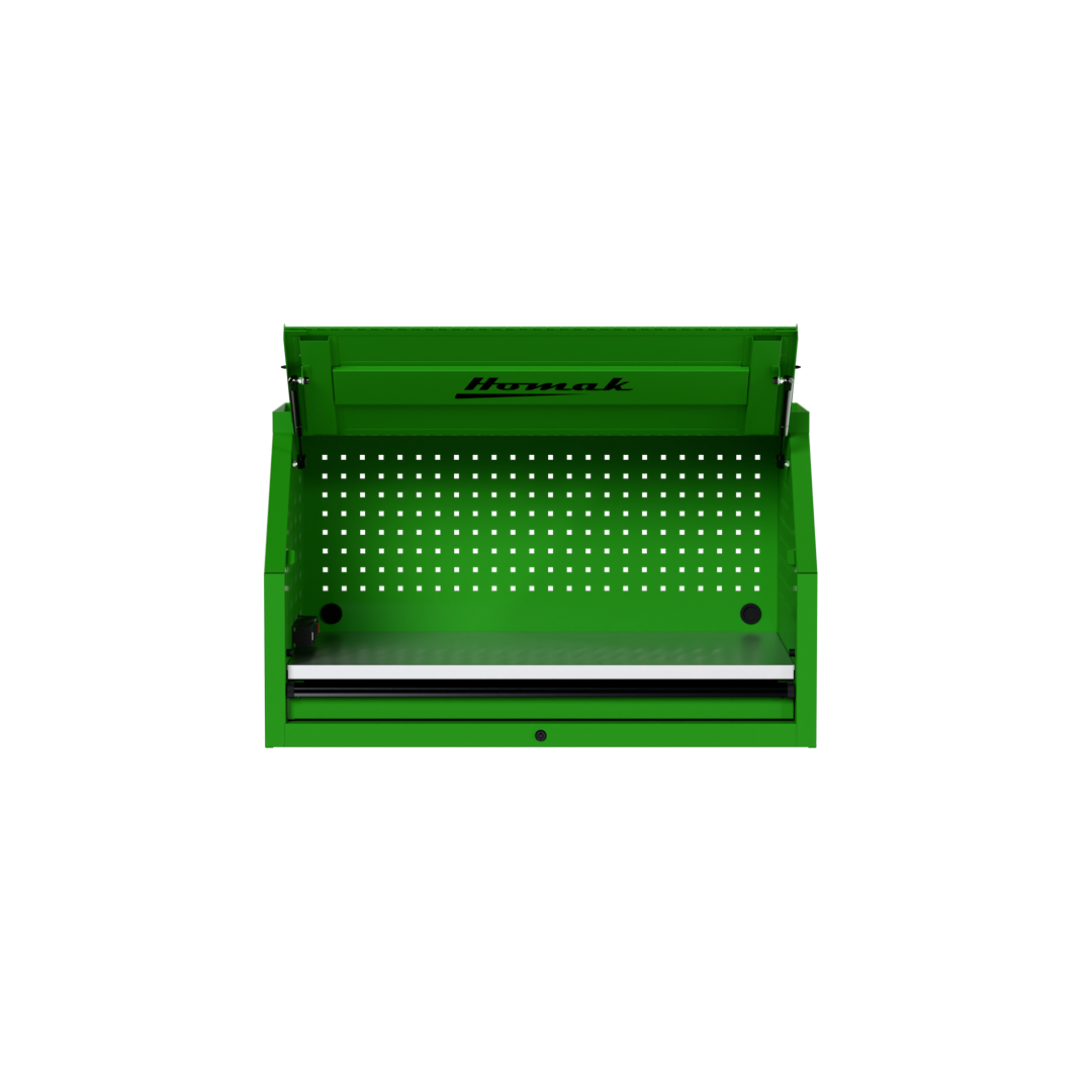 Lockable top hutch includes full-extension gas struts, grommet cutouts, and a power strip containing four (4) electric outlets and two (2) USB ports to store and charge phones, laptops, and other devices