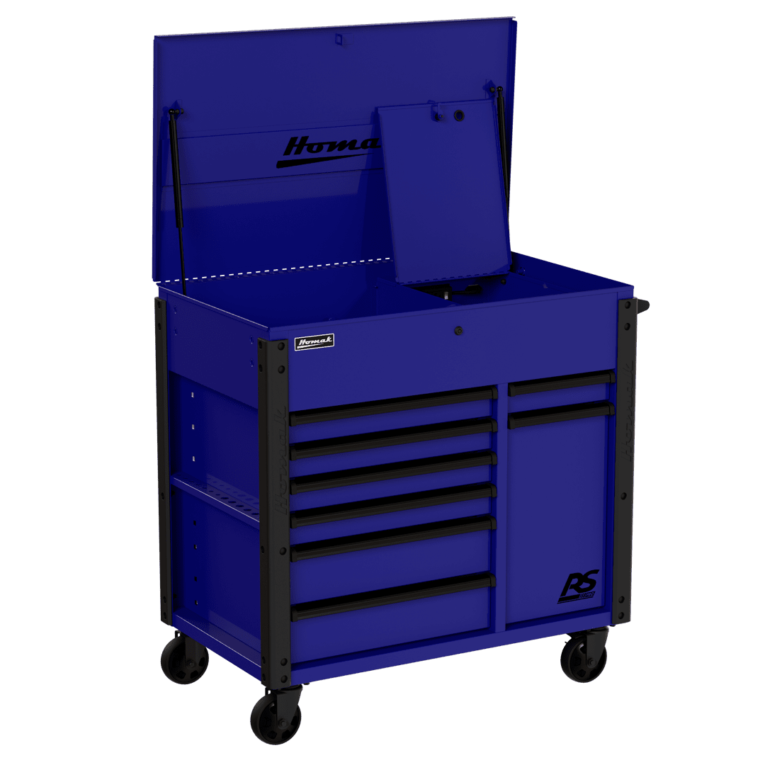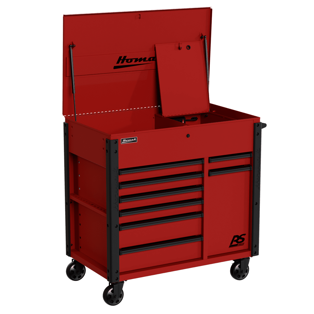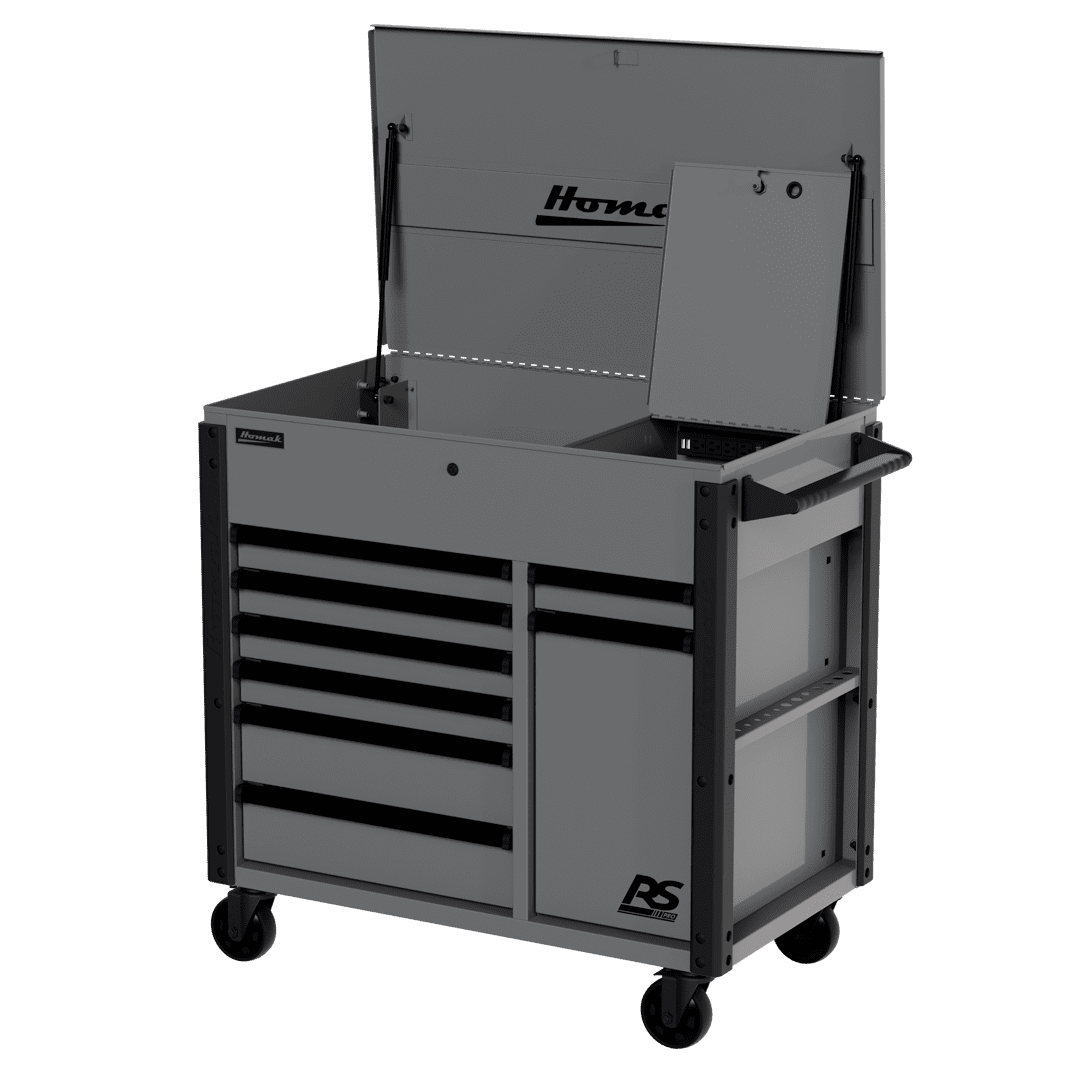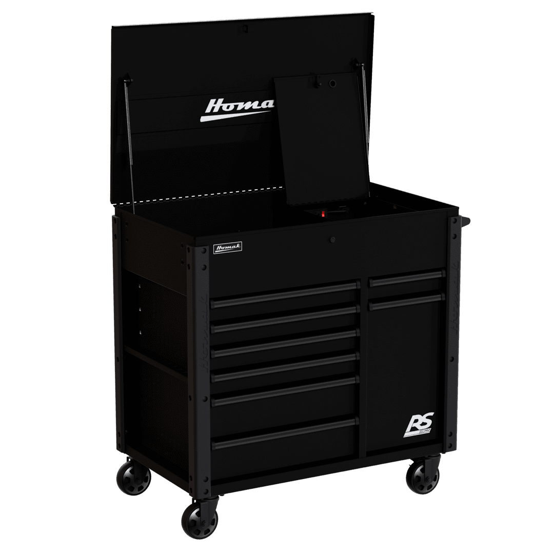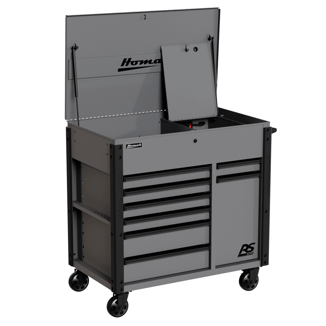 Top till includes full-extension gas struts and a lockable security compartment with an additional power strip to store and charge phones, laptops, and other devices