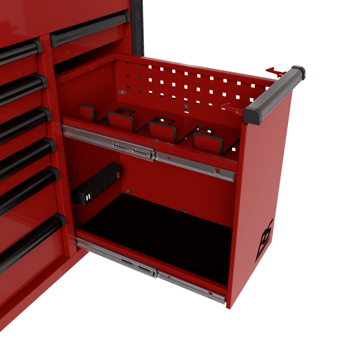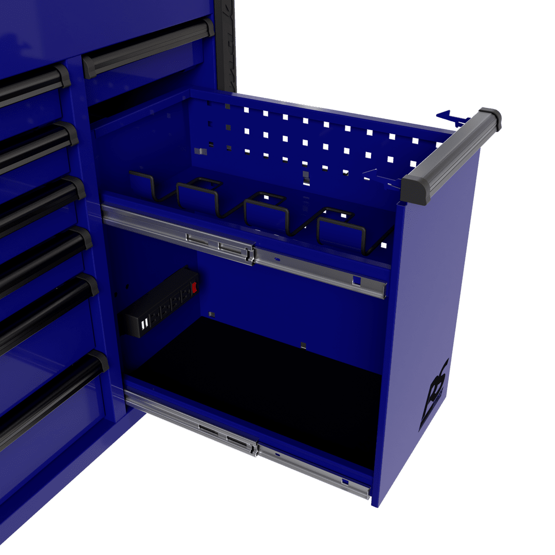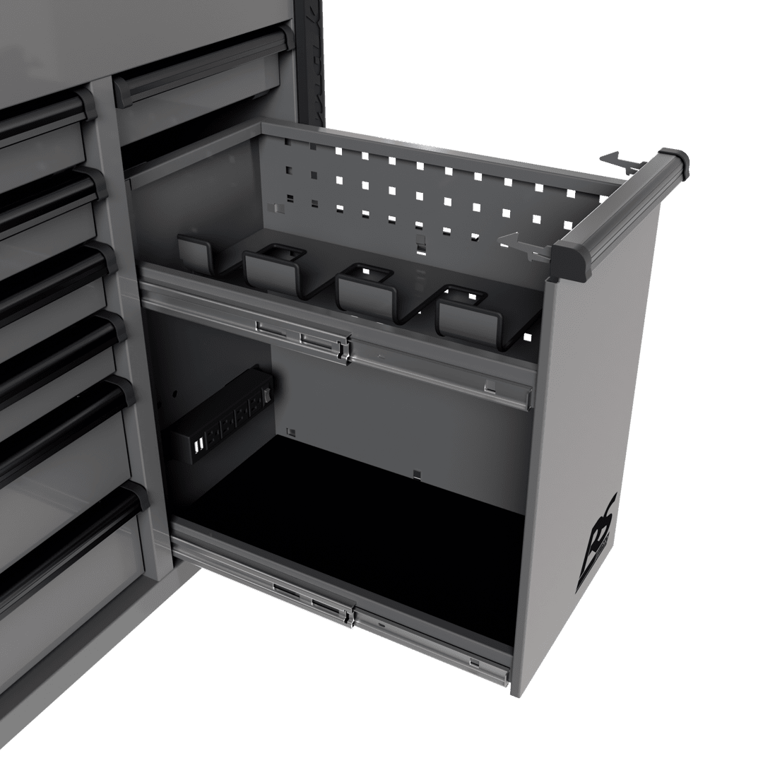 Power tool drawer with power strip includes four (4) electric outlets and two (2) USB ports to efficiently store, organize, and charge power tools in one place