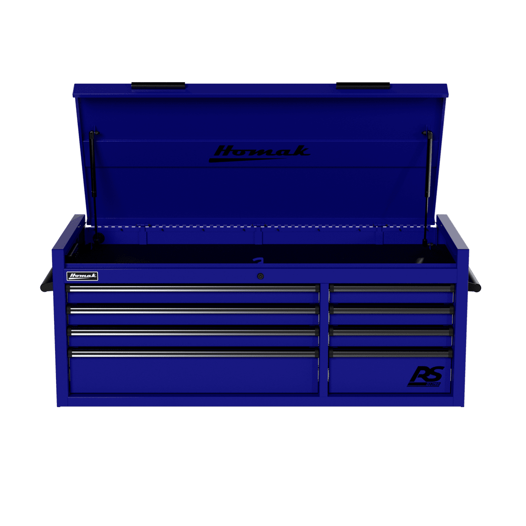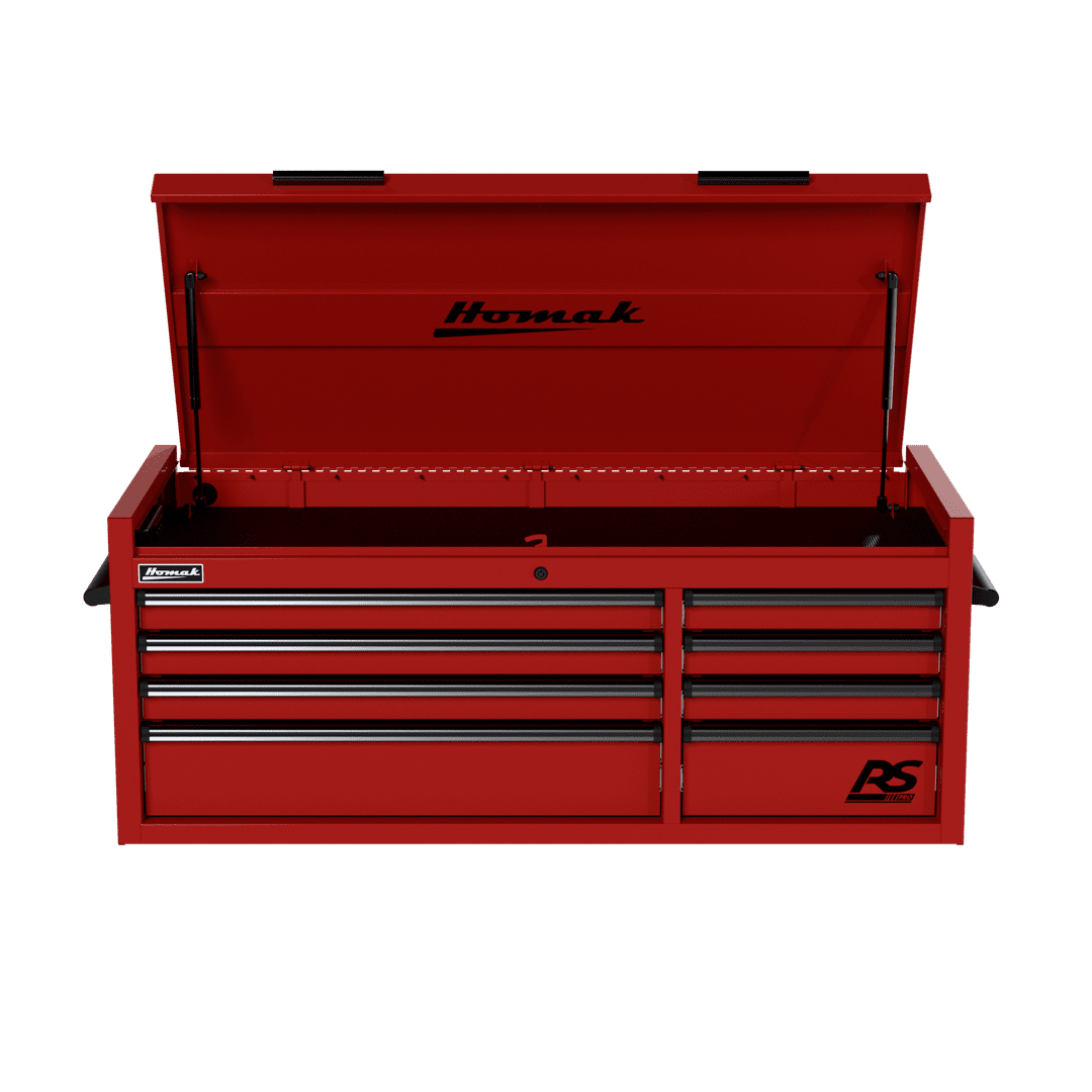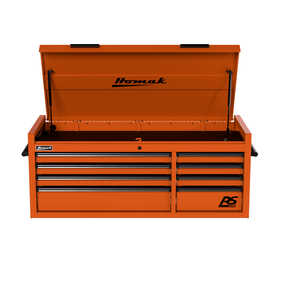 The 54″ Top Chest RS Pro comes in five bold colors: Fury Red, Midnight Black, Rally Sport Blue, Competition Orange, and Monster Green, ensuring that not only does it store your tools efficiently, but it also adds a touch of flair to your workspace. Experience the future of tool storage with the Homak 54″ Top Chest RS Pro.