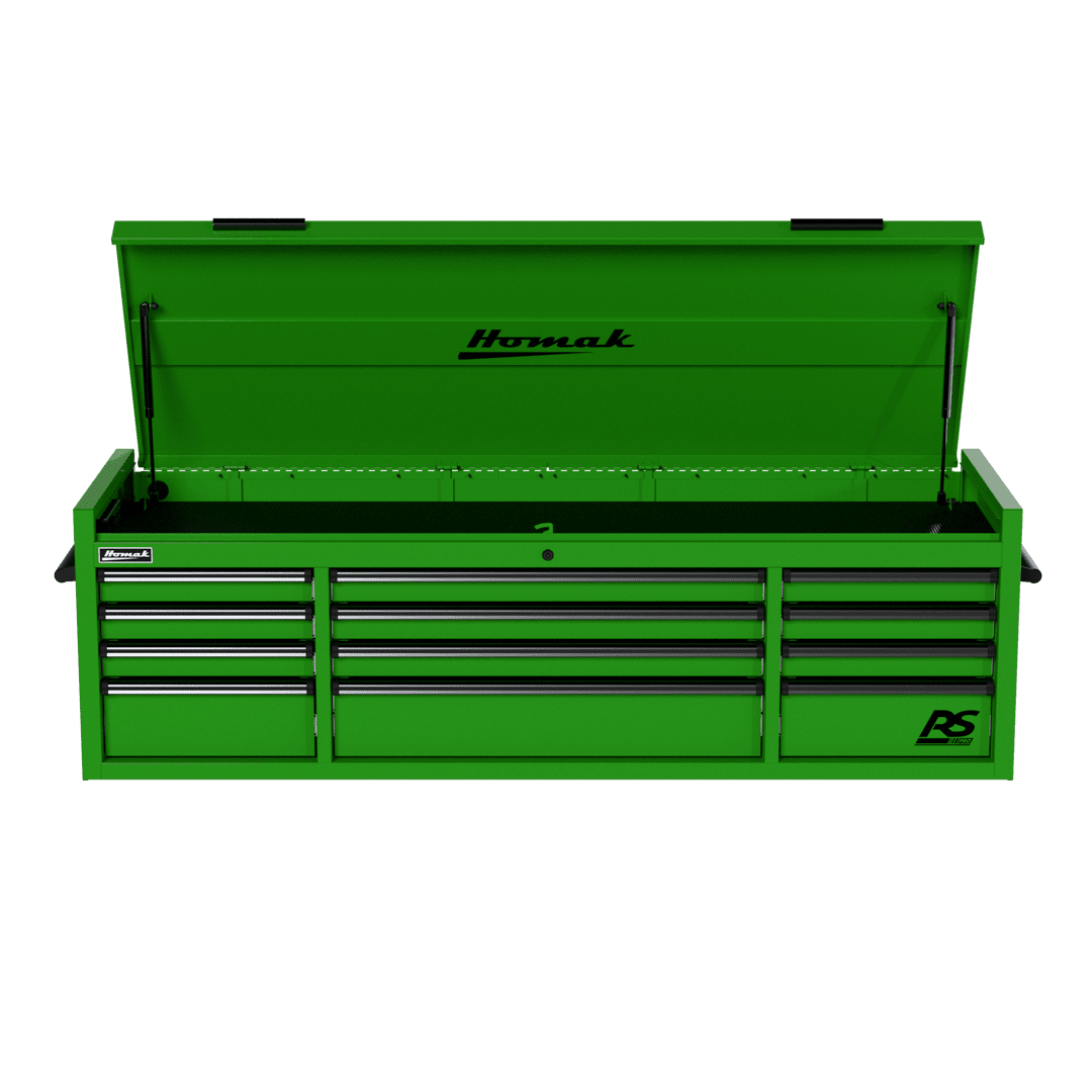 The 72″ Top Chest RS Pro comes in five bold colors: Fury Red, Midnight Black, Rally Sport Blue, Competition Orange, and Monster Green, ensuring that not only does it store your tools efficiently, but it also adds a touch of flair to your workspace. Experience the future of tool storage with the Homak 72″ Top Chest RS Pro.
