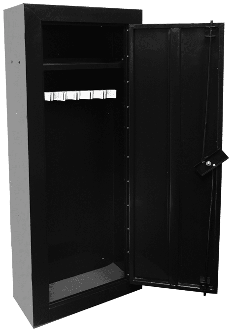 For additional protection, bolt the safe to the wall to enhance its security and stability. The 14-gun cabinet includes a fixed metal shelf, turning this security gun cabinet into a large safe with shelves, perfect for organizing your valuables and firearms. A full-length piano hinge secures the door to the cabinet, which is locked with an HMC high-security tubular system.