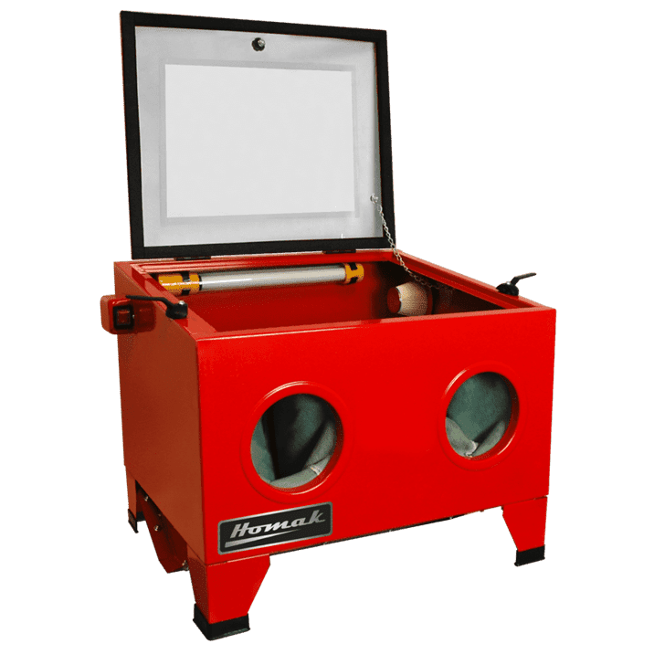 Solid steel leakproof tank includes four (4) ceramic nozzles (4mm, 5mm, 6mm, and 7mm), removable mesh-design work surface tray, and 1.5-inch vacuum port perfect for cleansing large parts